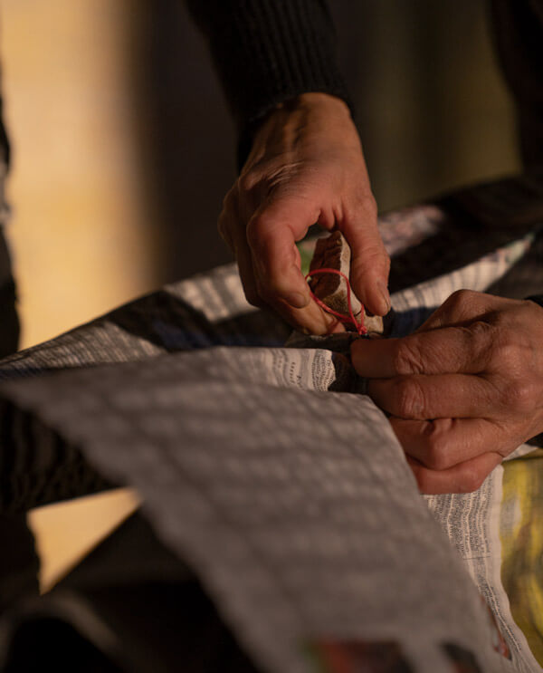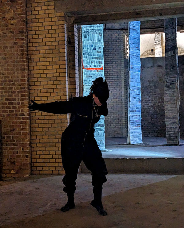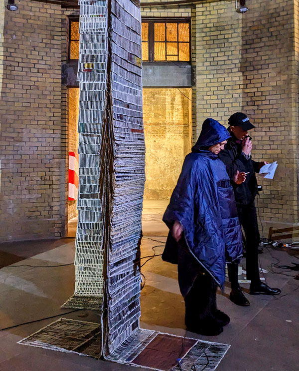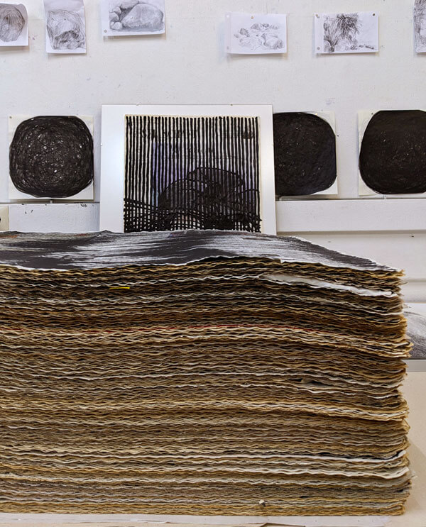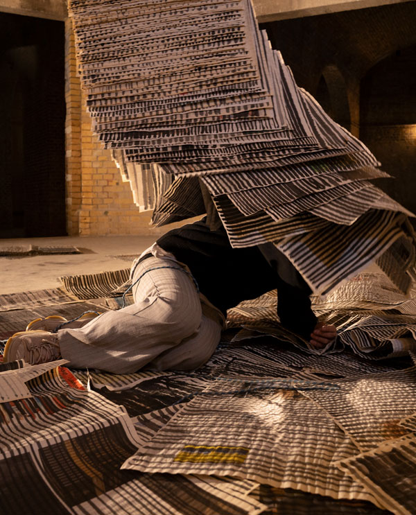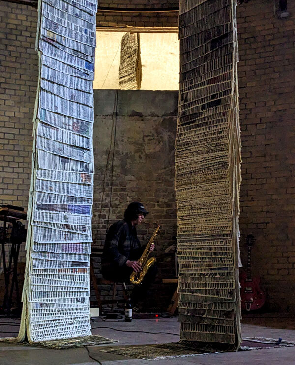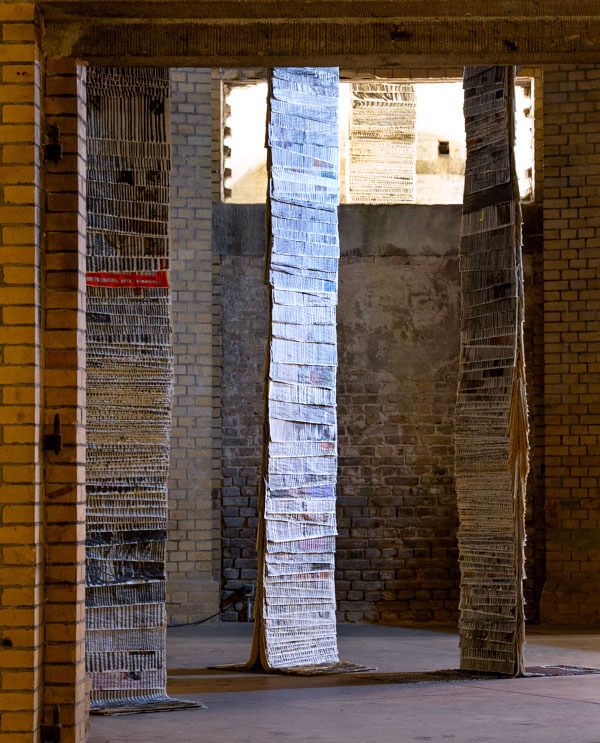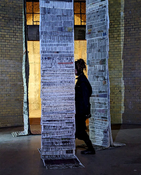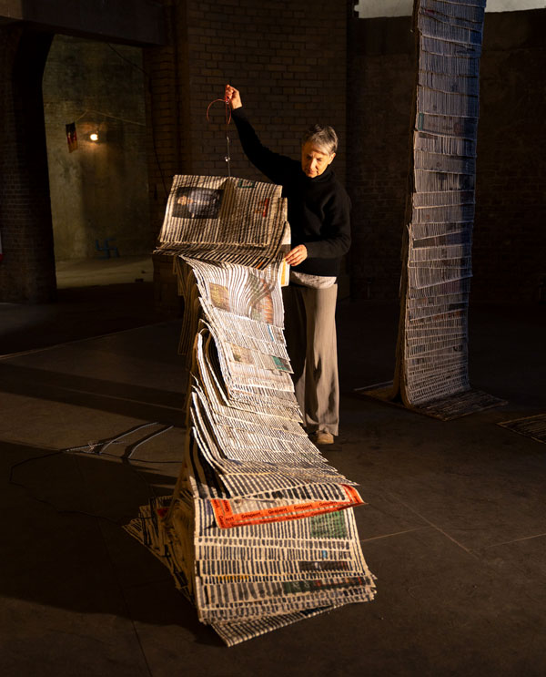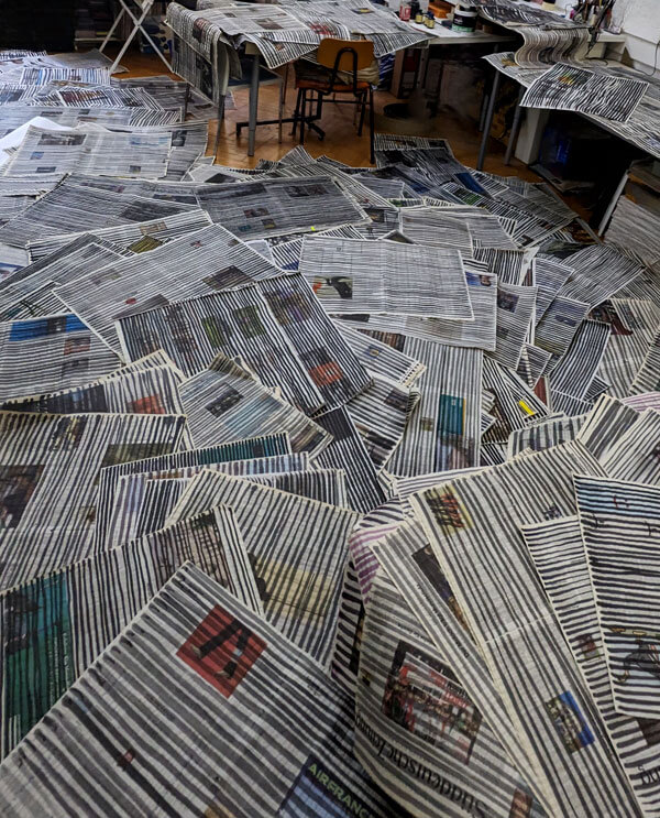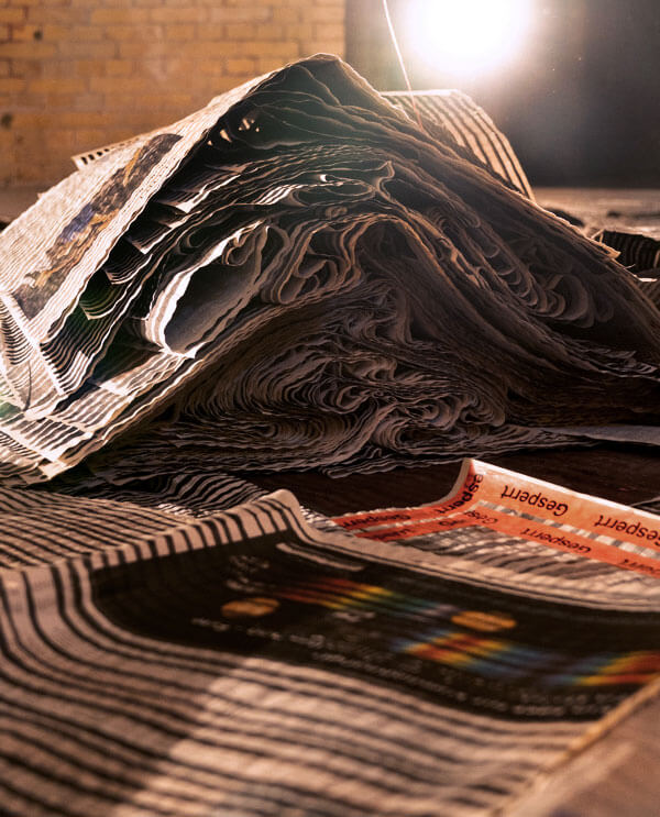 Die Papier-Installation »Fall« besteht aus ca. 500 mit schwarzen Tusche-Linien übermalten SZ-Zeitungsbögen.